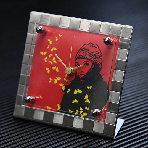 ステンレスベースに10mm角の彩光プレート“ピコ”を貼り付けクロックムーブメントを取り付けました。ピコプレートの貼り方はいろいろ。ベーシックパターンを選択していただきます。お客様のオリジナルデザインも可能です。ご相談ください。
